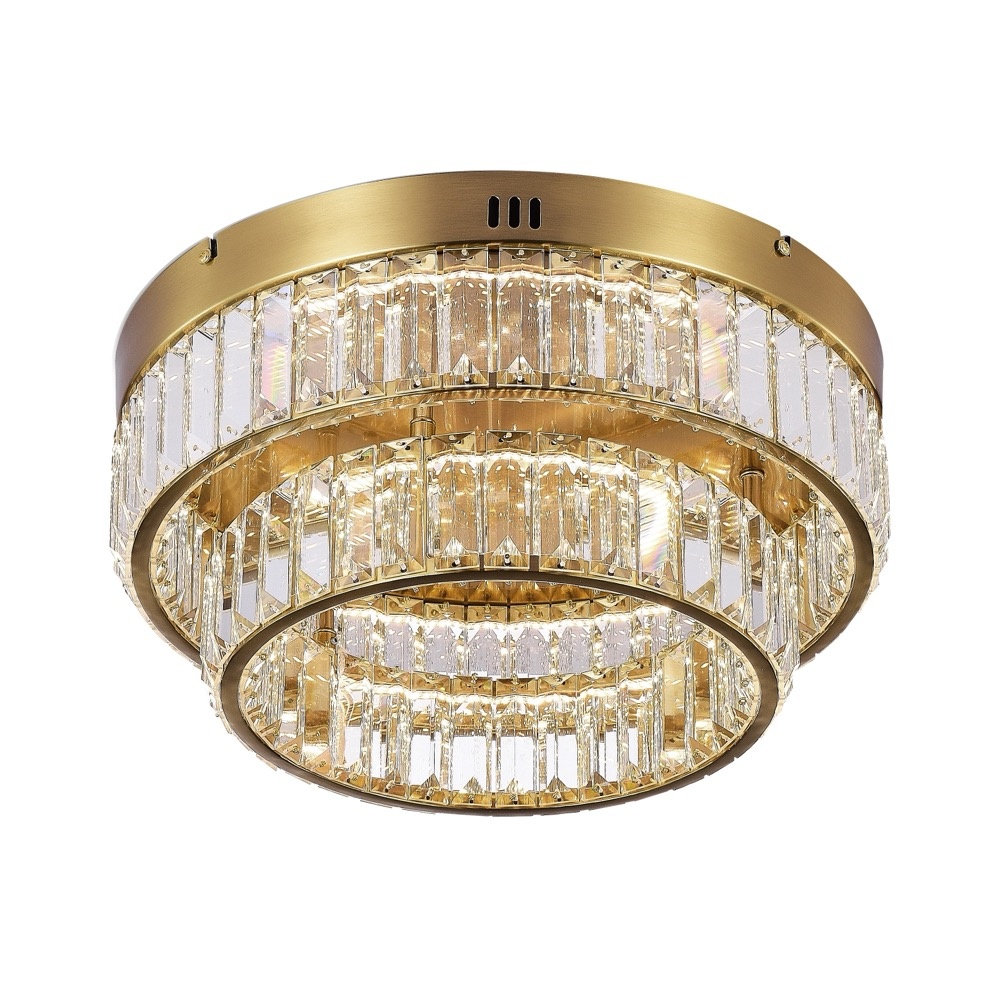 The Stella Collection double tier flushmount features dazzling crystals which are illuminated by bright LED. The frame is finished in a rich brushed brass. Due to its LED light source it is energy efficient. This model is dimmable and back with a 5 year warranty on the LED.
