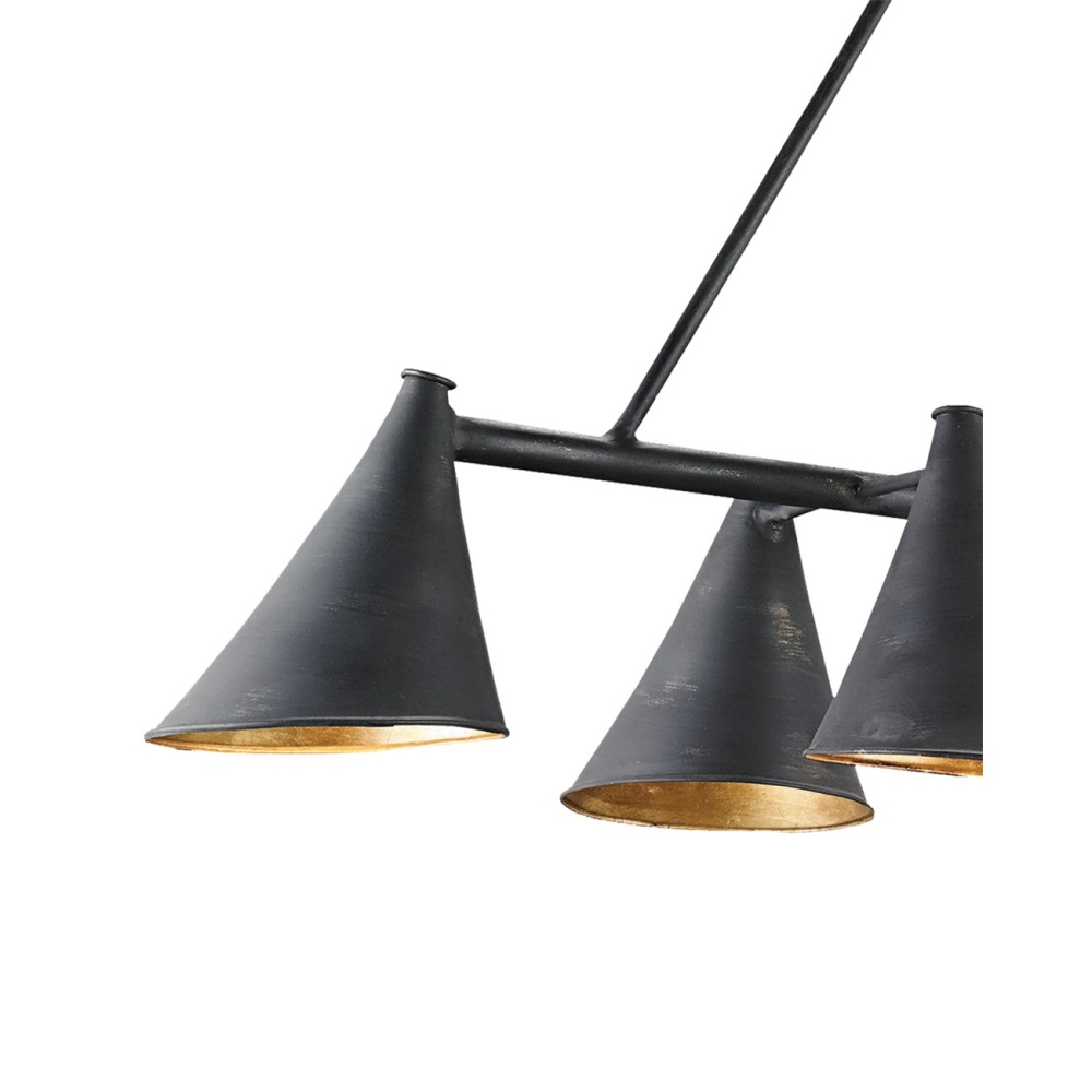 Mid-century modern chic has been given a bit of a rustic edge in the design of the Culpepper Rectangular Chandelier. Though it could be set squarely in that famous era, this large-scale fixture with six lights is surprisingly agile stylistically, as it fits within traditional interiors just as well as it blends seamlessly into contemporary settings. Light beams down from wrought iron shades treated to a contemporary gold leaf finish on the interiors for added warmth. The linear frame and exterior of the shades have been given an attractively distressed French black finish for a commanding appeal.