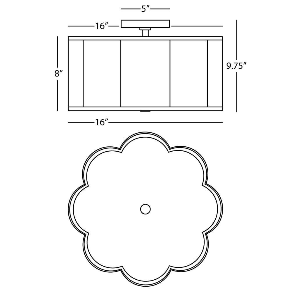 Aged Brass Finish Axis Flushmount with Scalloped Fondine Fabric Shade with Contrasting Trim - Axis features a scalloped design that diffuses the light in a most inviting way and also adds an elegant touch that is subtle and charming.