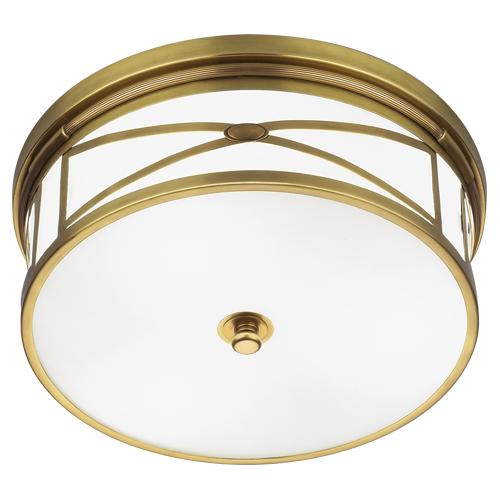 Antique Brass Finish Chase Flushmount with Frosted White Glass Shade - Chase is an attractive collection with a crisscrossed, metal frame work that provides a luxurious glow through a frosted glass shade.