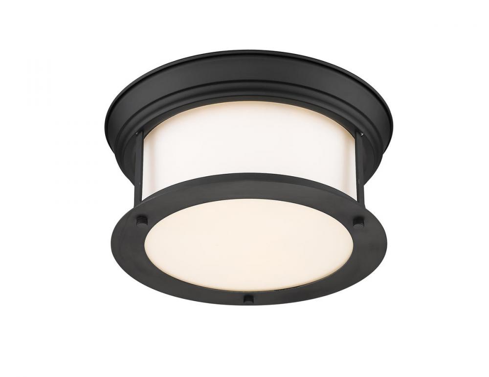 Let classic design create sophistication in a transitional living space. A wide cylindrical clear seedy glass shade nested in an open metal frame with a sleek Modern Matte Black finish make this two-light flush mount ceiling light a perfectly adaptable and tasteful lighting solution.
